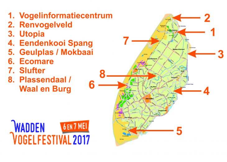 In totaal zijn er 8 belangrijke punten deze editie van hat Wadden Vogelfestival. Op de kaart hieronder worden alle punten genoemd. Onder de kaart krijgt u per punt meer uitleg.