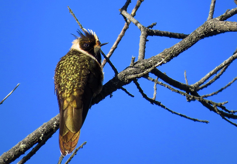 At 4 AM we left Rio Claro and headed towards Parque Nacional los Nevados. This park protects one of the most venerable biomes in Colombia, the paramo. In this peculiar high altitude habitat, composed of bromeliads, bushes en grasses, one of the most spectacular hummingbirds in Colombia can be found, the Buffy Helmetcrest. Since we had rather poor views of the Green-bearded Helmetcrest we were especially keen on seeing this stunner frame-filling in the scope.