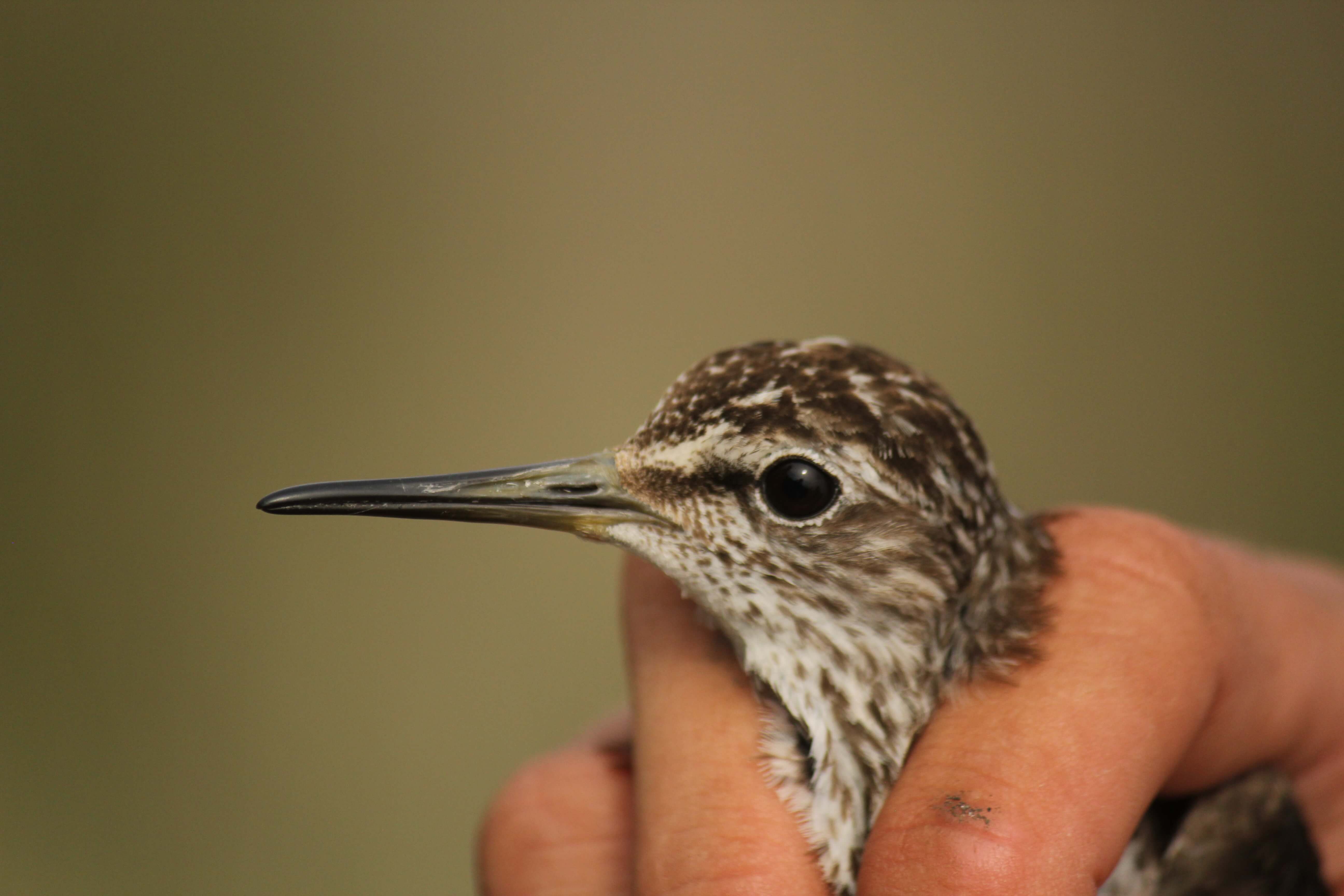 We kijken hier naar een close-up van een steltloper. Het vlekkerige patroon van de kop is daarbij te zien. Ook opvallend zijn de zwarte teugel, lichte wenkbrauwstreep tot achter het oog die het breedst is voor het oog, witte oogring (lichtste gedeelte van de kop) en donkere kruin (ongeveer zelfde kleur als teugel. Aan de voorkant van de nog net zichtbare kruin is geen middenkruinstreep zoals bij het meest genoemde foute antwoord Breedbekstrandloper. Daarnaast zou je bij deze soort een meer contrastrijke kop verwachten met meer zwarte tekening in plaats van de hier bruine tekening. Er blijft dan maar één soort over en dat is Bosruiter.