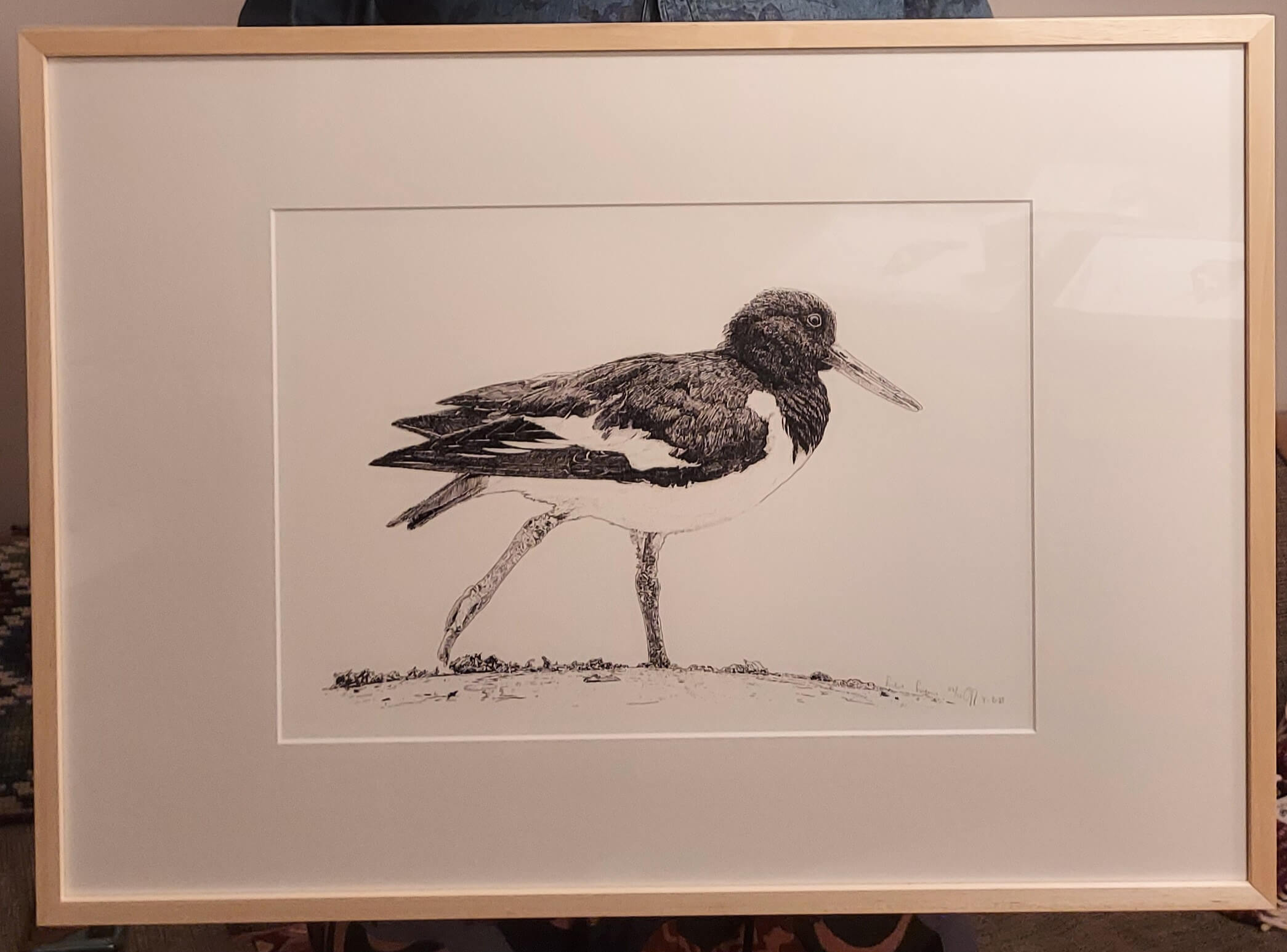 Prent van scholekster (t.w.v. € 20,00). Beschikbaar gesteld door Kunstenaar Nino Warmerdam.