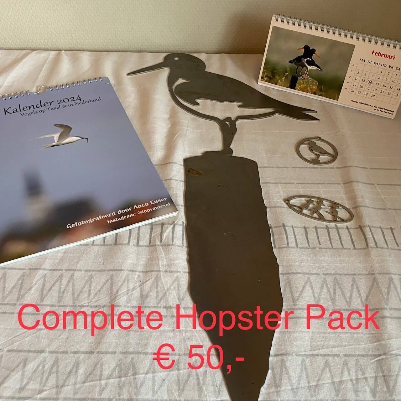 Hopsterpakket met metal Bird Scholekster en kalender (t.w.v. € 50,00). Beschikbaar gesteld door Texel Big Day team De Hopsters.