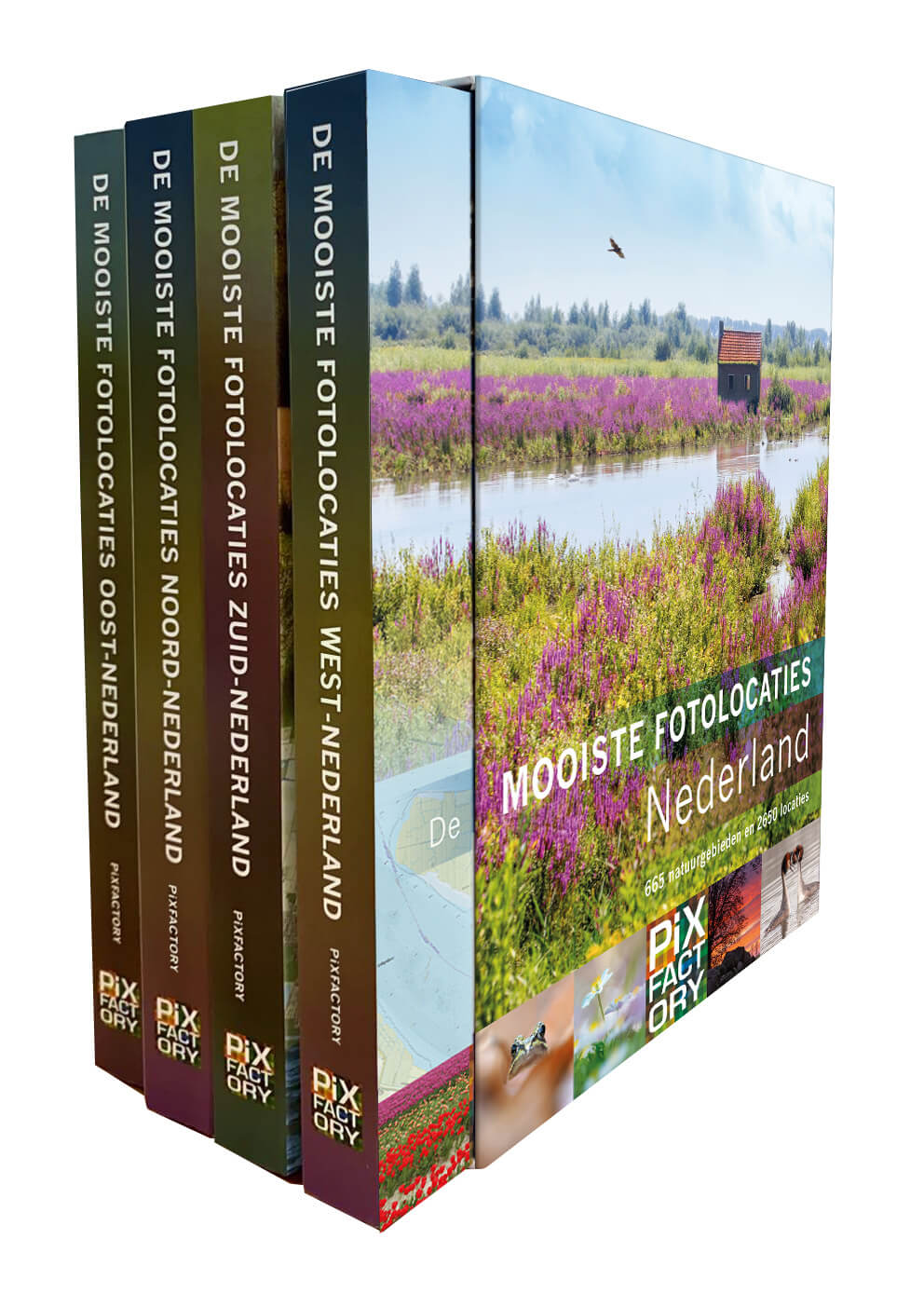 Cassette met vier boeken met de mooiste fotolocaties van Nederland (t.w.v. € 200,00). Beschikbaar gesteld door vogelkijken.nl.