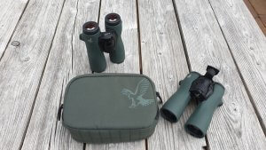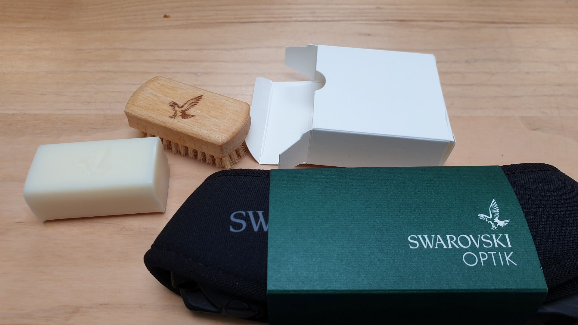 Uit de bekende groene doos van Swarovski komt een mooie groene zachte tas waarin een nog mooiere kijker zit. De tas is best ruim en goed gevoerd. De kijker ligt in deze tas op zijn zijkant en staat dus niet meer op de lenzen. Dit voelt wel veiliger aan. Verder zit er in de doos een klein doosje met een blokje zeep en een borsteltje. Dit is even vreemd. Het is bedoeld om de buitenzijde (niet zijnde het glas) mooi schoon te houden. Met het stukje natuurzeep en het borsteltje (beide voorzien van een Swarovski-logo) kan je periodiek je kijker onder de kraan netjes schoonmaken. Dit is voor de mensen die veel in de tropen zijn, of mensen die veel zonnebrandcrème (of andere crème) gebruiken een uitkomst. Antimuggenspul en zonnebrand zijn altijd een aanslag op rubber behuizingen van verrekijkers en telescopen. Maak je ze geregeld goed schoon met water en deze zeep dan blijft je kijker echt veel langer netjes. Verder wordt de kijker geleverd met een luxe brede draagriem die probleemloos aan net nieuwe ophangsysteem van Swarovski gekoppeld kan worden. Deze riem is ook weer verbeterd: hij is zachter en breder geworden en de lengteverstelling gaat een stuk prettiger dan bij het laatste model. Ik hoop dat deze riemen in de toekomst ook bij de EL-serie geleverd gaan worden. Als laatste zitten er ook een regenkapje en twee kleine rubber nopjes in de verpakking, die bedoeld zijn voor mensen die de geïntegreerde lenskappen niet willen gebruiken. Als je die van de kijker afhaalt, kan je de kleine rubberen nopjes daarvoor in de plaats zetten. Een heel compleet pakket dus.