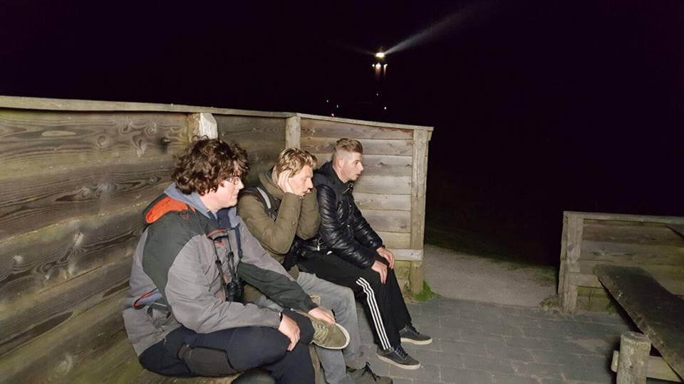 Er ontstaat een discussie binnen de groep of we in het donker nog door moeten gaan of dat we moeten stoppen. Jeroen wil koste wat koste doorgaan, maar ik vind het een idioot plan. Jeroen wil nog gaan trektellen in het donker bij de vuurtoren, maar ik zit er helemaal doorheen en heb daar geen trek in. Besloten wordt om eerst maar friet te gaan halen in het Eierlandsche huis. We krijgen een warm onthaal en worden op de foto gezet. De patat met kroket en frikandel smaakt dusdanig goed dat ik overstag ga en we toch naar de vuurtoren gaan. We treffen buiten weer de jonge hondjes die nog steeds geen Kleine Karekiet hebben. We voorzien ze van wat info en gaan op weg. We zullen echter niets meer vinden bij de vuurtoren.