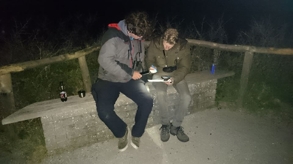 Via de tuintjes (overvliegende Goudplevier) fietsen we naar het Krimbos. Hier staan Waterhoen en Zomertaling op het programma. Na een tijdje fietsen en veel stilte staan we even stil bij een bankje naast een slootje voor Waterhoen waarop ik ineens een uil rond zie vliegen. Jeroen heeft zijn verrekijker al om (die van mij zat onderin de fietstas) en kan met behulp van het licht van de vuurtoren zien dat het een Ransuil betreft. De soort wordt gemeld in de appgroep en daarna succesvol getwitcht door de jonge honden. De Zomertaling en Waterhoen laten echter niet van zich horen.