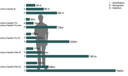 - Detectorresolutie: voor een bereik van maximaal 100 m, met een lage detailscherpte, is een detector van 160 x 120 pixels voldoende. Voor een gemiddelde afstand tot ± 600 m, met een goede detailscherpte, wordt een detector van 320 x 240 pixels aanbevolen. Voor grotere afstanden tot ± 1.200 m, met een zeer goede detailscherpte, moet u gaan voor een detector met minimaal 640 x 480 pixels.