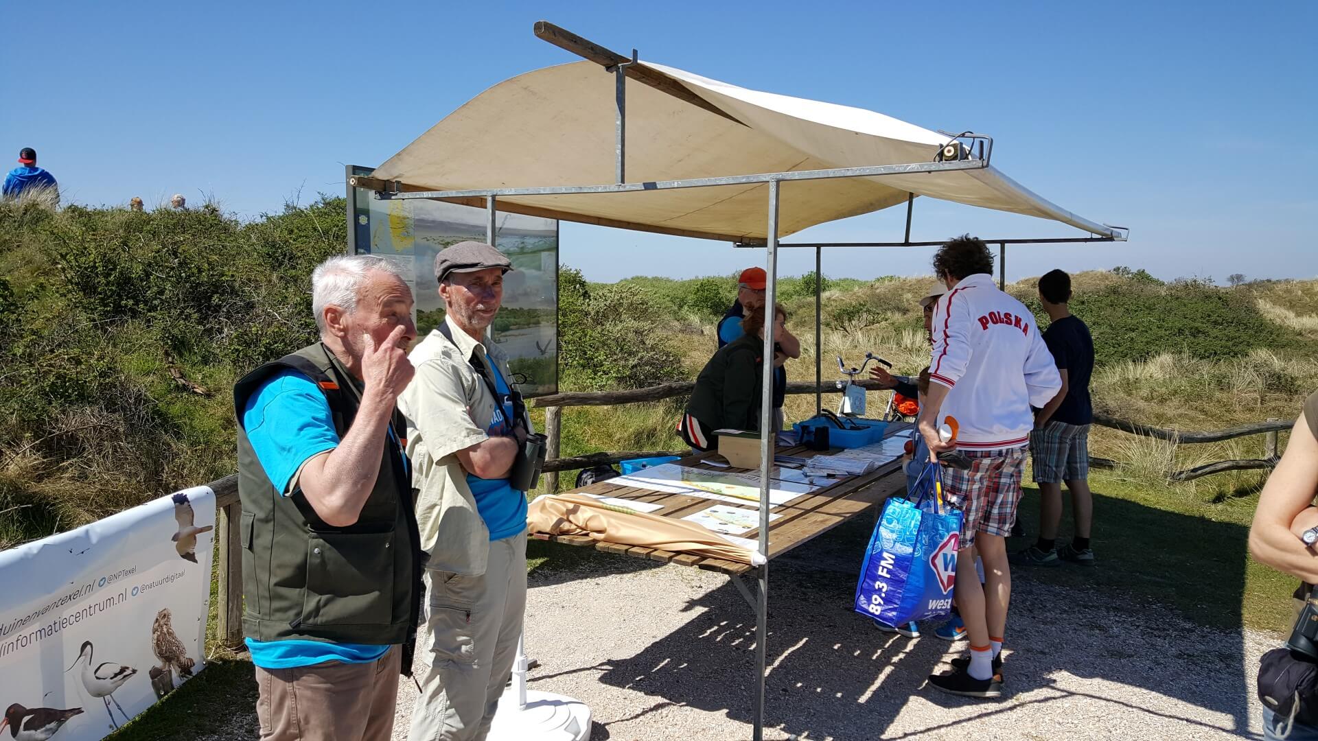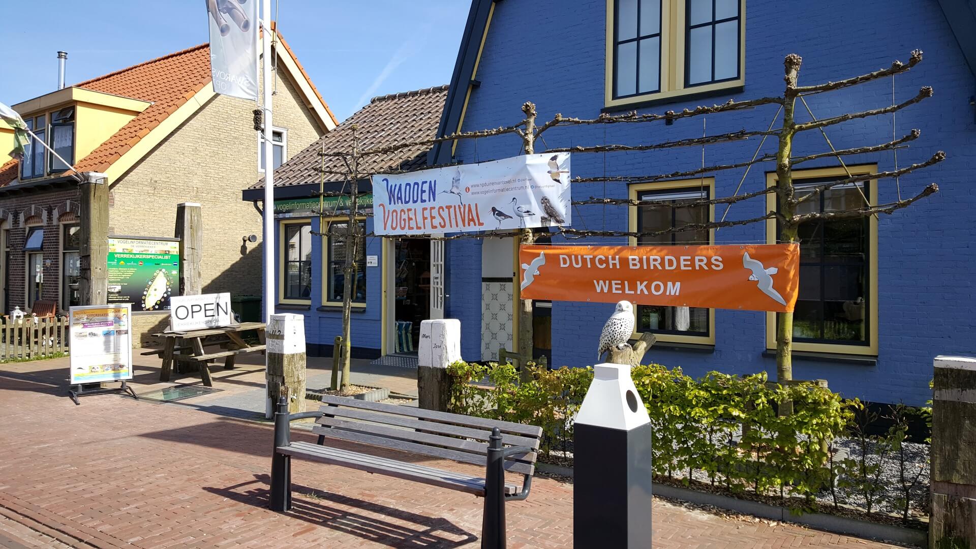 Het vogelinformatiecentrum met de banners voor het weekend.