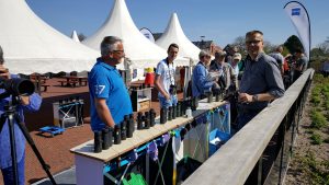 Caroline Walta krijgt hier de prijs (van Marc Plomp) voor de soort van de dag, 4 Witleugelsterns. Zij kreeg een verrekijker van Bynolyt. De Stork 8×42.