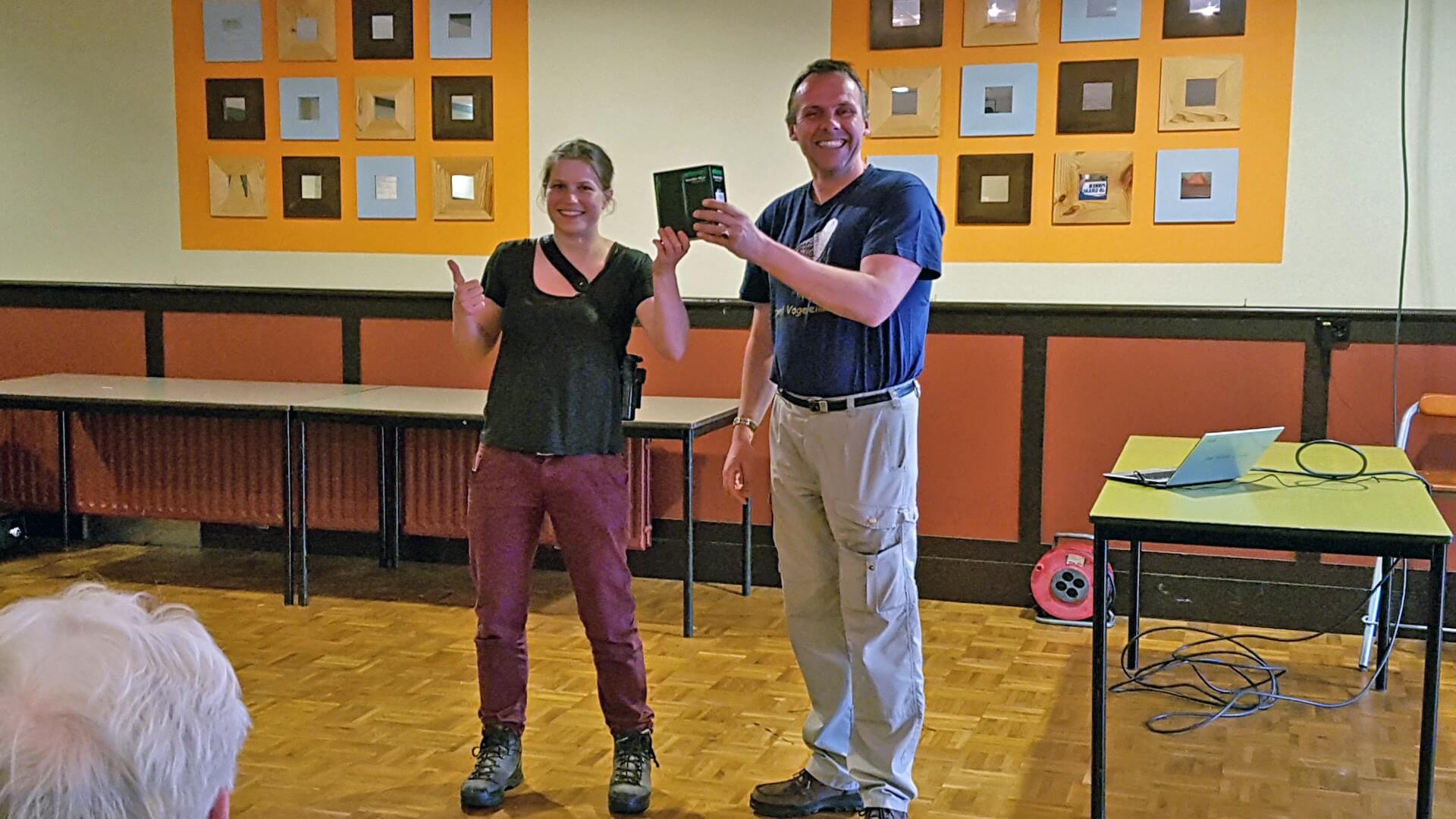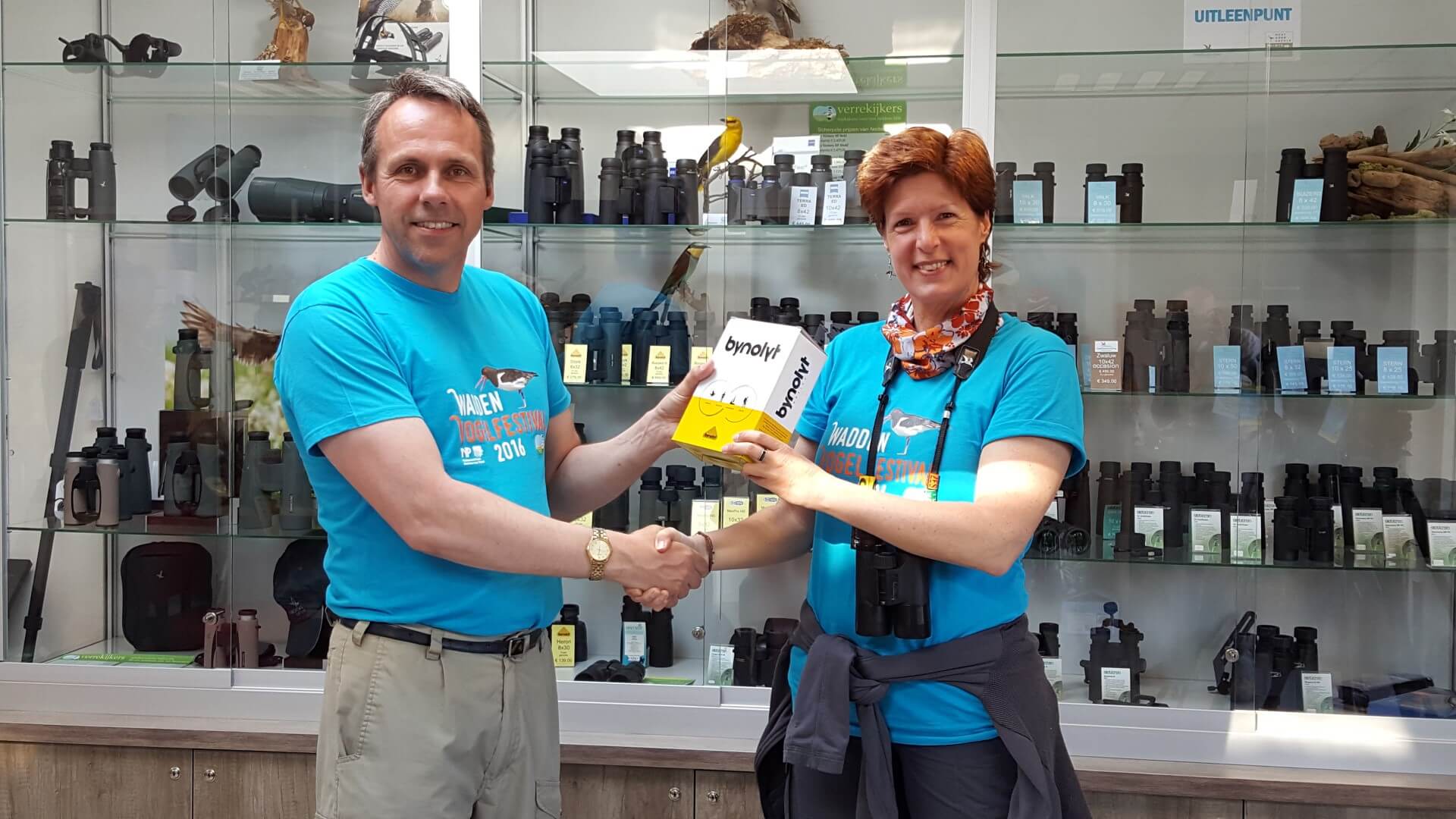 Vivian Jacobs krijgt hier van Marc Plomp de prijs voor de soort van de dag, een Roodpootvalk. Zij kreeg een verrekijker van Opticron. De Traveller 8×32.